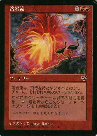溶岩流は、飛行を持たない各クリーチャーにX点のダメージを与える。 溶岩流がスタックにあるかぎり、各クリーチャーは「(T):このターン、溶岩流がこのクリーチャーに与える次のダメージを1点軽減する。」を持つ。