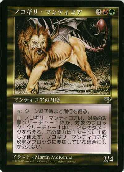(4):ノコギリ・マンティコアはターン終了時まで飛行を得る。 (1):攻撃かブロックしているクリーチャー1体を対象とする。ノコギリ・マンティコアはそれに2点のダメージを与える。この能力はノコギリ・マンティコアが攻撃かブロックしている場合にしか起動できず、各ターンに1回のみ起動できる。