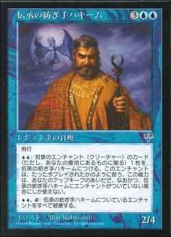 飛行 (青)(青):あなたの墓地にあるオーラ(Aura)・カード1枚を対象とし、それを伝承の紡ぎ手ハキームにつけた状態で戦場に戻す。この能力は、あなたのアップキープの間で伝承の紡ぎ手ハキームがエンチャントされていない場合にのみ起動できる。 (青)(青),(T):伝承の紡ぎ手ハキームにつけられているすべてのオーラを破壊する。