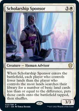 When Scholarship Sponsor enters the battlefield, each player who controls fewer lands than the player who controls the most lands searches their library for a number of basic land cards less than or equal to the difference, puts those cards onto the battlefield tapped, then shuffles.