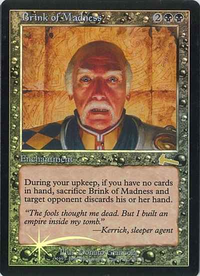 あなたのアップキープの開始時に、あなたの手札にカードが1枚もない場合、対戦相手1人を対象とする。狂気の瀬戸際を生け贄に捧げ、そのプレイヤーは自分の手札を捨てる。