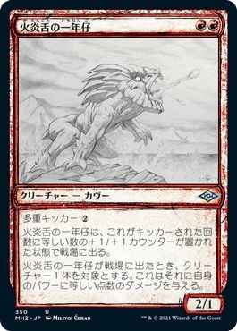 火炎舌の一年仔が戦場に出たとき、クリーチャー1体を対象とする。これはそれに自身のパワーに等しい点数のダメージを与える。