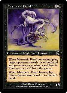 When Mesmeric Fiend enters the battlefield, target opponent reveals their hand and you choose a nonland card from it. Exile that card. When Mesmeric Fiend leaves the battlefield, return the exiled card to its owner's hand.