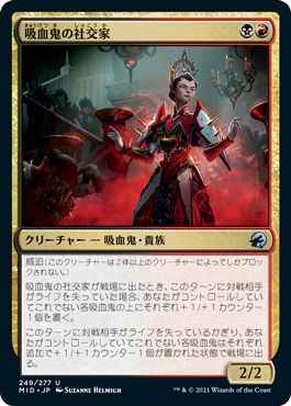 吸血鬼の社交家が戦場に出たとき、このターンに対戦相手がライフを失っていた場合、あなたがコントロールしていてこれでない各吸血鬼(Vampire)の上にそれぞれ+1/+1カウンター1個を置く。