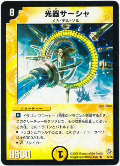 ドラゴン・ブロッカー(相手のドラゴンが攻撃するとき、このクリーチャーをタップして、その攻撃を阻止してよい。 その後、そのドラゴンとバトルする)ドラゴンとバトルするとき、このクリーチャーのパワーは+6000される。W(ダブル)・ブレイカー