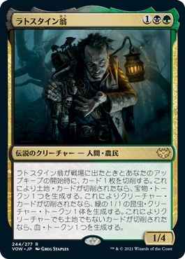 ラトスタイン翁が戦場に出たときとあなたのアップキープの開始時に、カード1枚を切削する。これにより土地カードが切削されたなら、宝物(Treasure)トークン1つを生成する。これによりクリーチャー・カードが切削されたなら、緑の1/1の昆虫(Insect)クリーチャー・トークン1体を生成する。これによりクリーチャーでも土地でもないカードが切削されたなら、血(Blood)トークン1つを生成する。