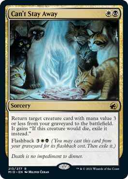 あなたの墓地にありマナ総量が3以下であるクリーチャー・カード1枚を対象とする。それを戦場に戻す。それは「このクリーチャーが死亡するなら、代わりにこれを追放する。」を得る。