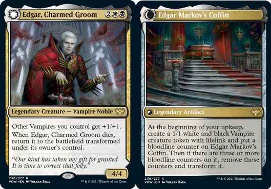 Other Vampires you control get +1/+1. When Edgar, Charmed Groom dies, return it to the battlefield transformed under its owner's control./At the beginning of your upkeep, create a 1/1 white and black Vampire creature token with lifelink and put a bloodline counter on Edgar Markov's Coffin. Then if there are three or more bloodline counters on it, remove those counters and transform it.