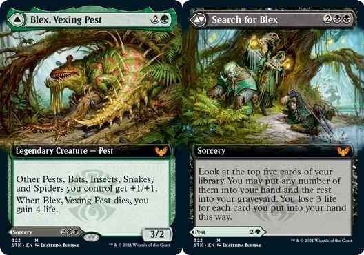 When Blex, Vexing Pest dies, you gain 4 life./Look at the top five cards of your library. You may put any number of them into your hand and the rest into your graveyard. You lose 3 life for each card you put into your hand this way.