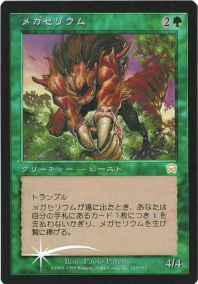 トランプル メガセリウムが戦場に出たとき、あなたが自分の手札にあるカード1枚につき(1)を支払わないかぎり、メガセリウムを生け贄に捧げる。