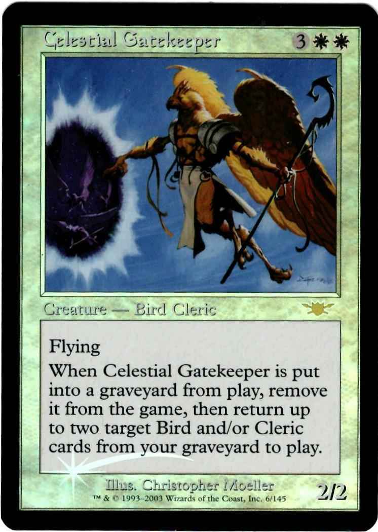 Flying When Celestial Gatekeeper dies, exile it, then return up to two target Bird and/or Cleric permanent cards from your graveyard to the battlefield.