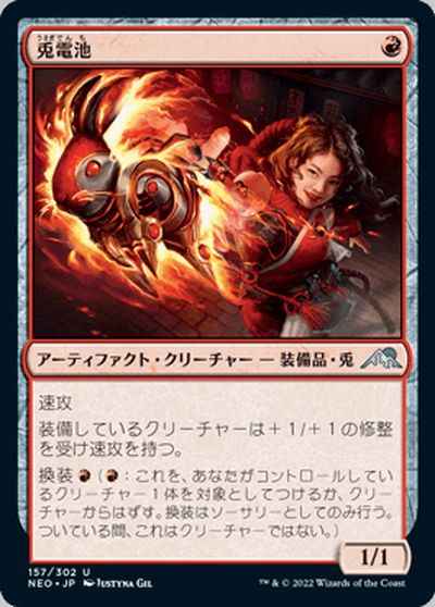 換装(赤)((赤):これを、あなたがコントロールしているクリーチャー1体を対象としてつけるか、クリーチャーからはずす。換装はソーサリーとしてのみ行う。ついている間、これはクリーチャーではない。)
