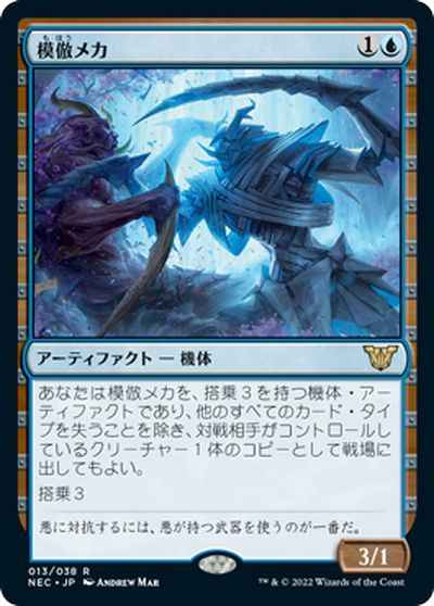 あなたは模倣メカを、搭乗3を持つ機体(Vehicle)アーティファクトであり、他のすべてのカード・タイプを失うことを除き、対戦相手がコントロールしているクリーチャー1体のコピーとして戦場に出してもよい。