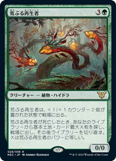荒ぶる再生者が死亡したとき、あなたのライブラリーから基本土地カード最大X枚を探し、戦場に出し、その後ライブラリーを切り直す。Xは、荒ぶる再生者のパワーに等しい。