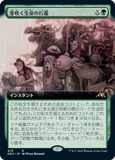 マナ総量がXより小さいクリーチャー1体を対象とする。あなたのライブラリーからそのクリーチャーと同じ名前を持つクリーチャー・カード1枚を探し、タップ状態で戦場に出す。その後、ライブラリーを切り直す。