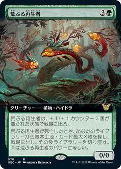 荒ぶる再生者が死亡したとき、あなたのライブラリーから基本土地カード最大X枚を探し、戦場に出し、その後ライブラリーを切り直す。Xは、荒ぶる再生者のパワーに等しい。