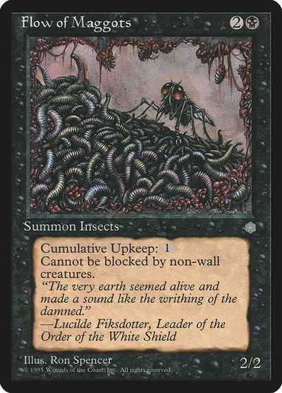 累加アップキープ(1)(あなたのアップキープの開始時に、このパーマネントの上に経年(age)カウンターを1個置く。その後あなたがこの上に置かれている経年カウンター1個につきアップキープ・コストを1回支払わないかぎり、それを生け贄に捧げる。) Flow of Maggotsは壁(Wall)でないクリーチャーによってはブロックされない。