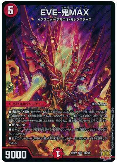 鬼S-MAX進化:自分がゲームに負ける時、またはこのクリーチャーが離れる時、かわりに自分の表向きのカードを3枚破壊してもよい。(このクリーチャーは進化元を必要としない。自分のS-MAX進化クリーチャーが2体以上あれば、そのうちの1体を残し、残りをすべて手札に戻す)