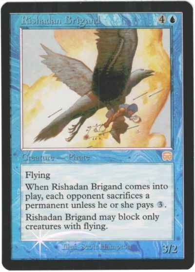 Flying When Rishadan Brigand enters the battlefield, each opponent sacrifices a permanent unless they pay {3}. Rishadan Brigand can block only creatures with flying.