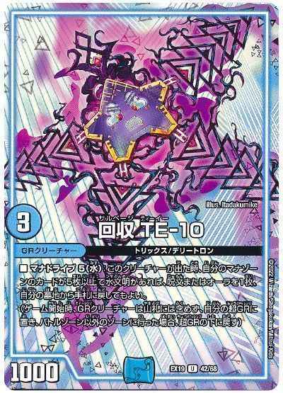 マナドライブ 5(水):このクリーチャーが出た時、自分のマナゾーンのカードが5枚以上で水文明があれば、呪文またはオーラを1枚、自分の墓地から手札に戻してもよい。