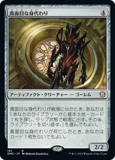 真面目な身代わりが戦場に出たとき、あなたは「あなたのライブラリーから基本土地カード1枚を探し、タップ状態で戦場に出す。その後、ライブラリーを切り直す。」を選んでもよい。 真面目な身代わりが死亡したとき、あなたはカード1枚を引いてもよい。