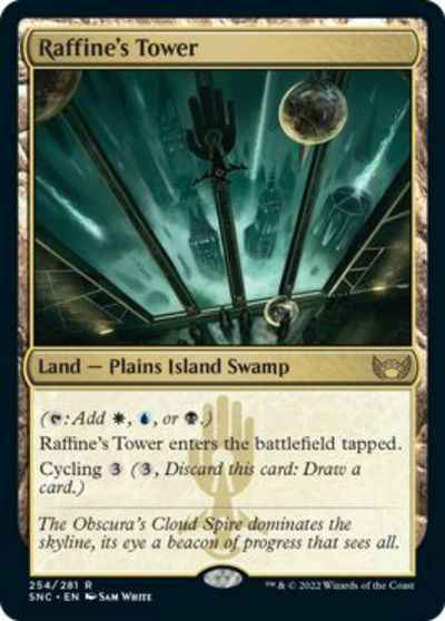 ({T}: Add {W}, {U}, or {B}.) Raffine's Tower enters the battlefield tapped. Cycling {3} ({3}, Discard this card: Draw a card.)