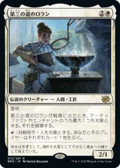 警戒 第三の道のロランが戦場に出たとき、アーティファクトやエンチャントのうち最大1つを対象とする。それを破壊する。 (T):対戦相手1人を対象とする。あなたとそのプレイヤーはそれぞれカード1枚を引く。