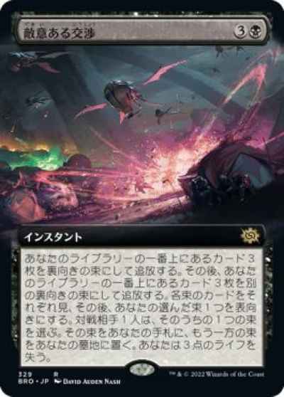 あなたのライブラリーの一番上にあるカード3枚を裏向きの束にして追放する。その後、あなたのライブラリーの一番上にあるカード3枚を別の裏向きの束にして追放する。各束のカードをそれぞれ見て、その後、あなたの選んだ束1つを表向きにする。対戦相手1人は、そのうちの1つの束を選ぶ。その束をあなたの手札に、もう一方の束をあなたの墓地に置く。あなたは3点のライフを失う。