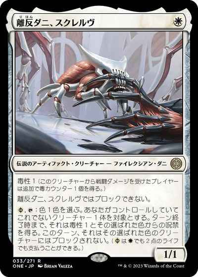 毒性1(このクリーチャーから戦闘ダメージを受けたプレイヤーは追加で毒(poison)カウンター1個を得る。) 離反ダニ、スクレルヴではブロックできない。 (白/Φ),(T):色1色を選ぶ。あなたがコントロールしていてこれでないクリーチャー1体を対象とする。ターン終了時まで、それは毒性1とその選ばれた色からの呪禁を得る。このターン、それはその選ばれた色のクリーチャーにはブロックされない。((白/Φ)は(白)でも2点のライフでも支払うことができる。)