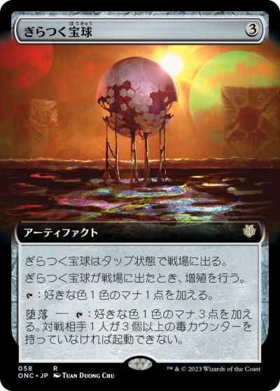 ぎらつく宝球はタップ状態で戦場に出る。 ぎらつく宝球が戦場に出たとき、増殖を行う。 (T):好きな色1色のマナ1点を加える。 堕落 ― (T):好きな色1色のマナ3点を加える。対戦相手1人が3個以上の毒(poison)カウンターを持っていなければ起動できない。