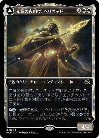 光輝の夜明け、ヘリオッドが戦場に出たとき、あなたの墓地にあり神(God)でないエンチャント・カード1枚を対象とする。それをあなたの手札に戻す。 (3)(青/Φ):光輝の夜明け、ヘリオッドを変身させる。起動はソーサリーとしてのみ行う。((青/Φ)は(青)でも2点のライフでも支払うことができる。)/あなたは呪文を、それが瞬速を持っているかのように唱えてもよい。 あなたが呪文を唱えるためのコストは、このターンに対戦相手が引いたカード1枚につき(1)少なくなる。