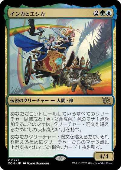 あなたがコントロールしているすべてのクリーチャーは警戒と「(T):好きな色1色のマナ1点を加える。このマナは、クリーチャー呪文を唱えるためにしか支払えない。」を持つ。 あなたがクリーチャー呪文を唱えるたび、それを唱えるためにクリーチャーからのマナ3点以上が支払われていた場合、カード1枚を引く。