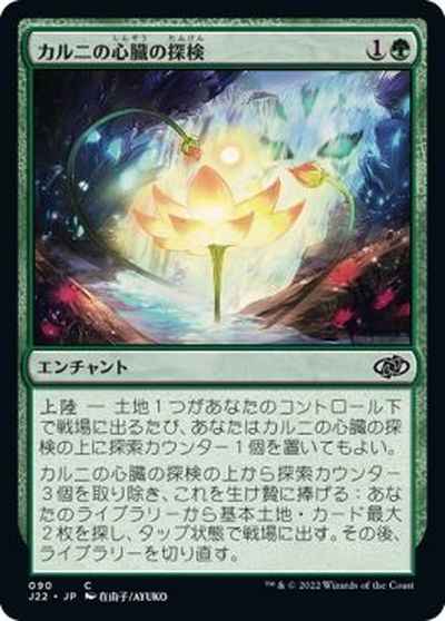 上陸 ― 土地が1つあなたのコントロール下で戦場に出るたび、あなたはカルニの心臓の探検の上に探索(quest)カウンターを1個置いてもよい。 カルニの心臓の探検から探索カウンターを3個取り除くとともに、それを生け贄に捧げる:あなたのライブラリーから基本土地カードを最大2枚まで探し、それらをタップ状態で戦場に出し、その後ライブラリーを切り直す。