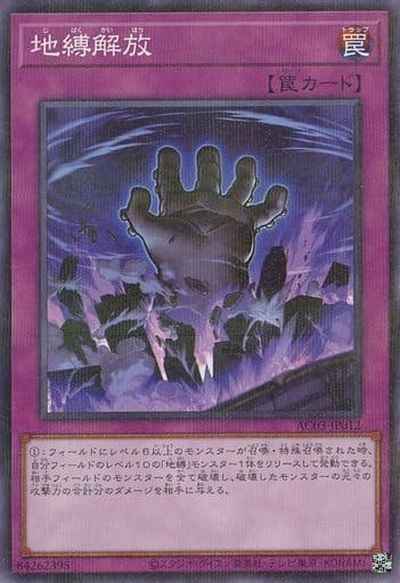・:フィールドにレベル6以上のモンスターが召喚・特殊召喚された時、自分フィールドのレベル10の「地縛」モンスター1体をリリースして発動できる。相手フィールドのモンスターを全て破壊し、破壊したモンスターの元々の攻撃力の合計分のダメージを相手に与える。
