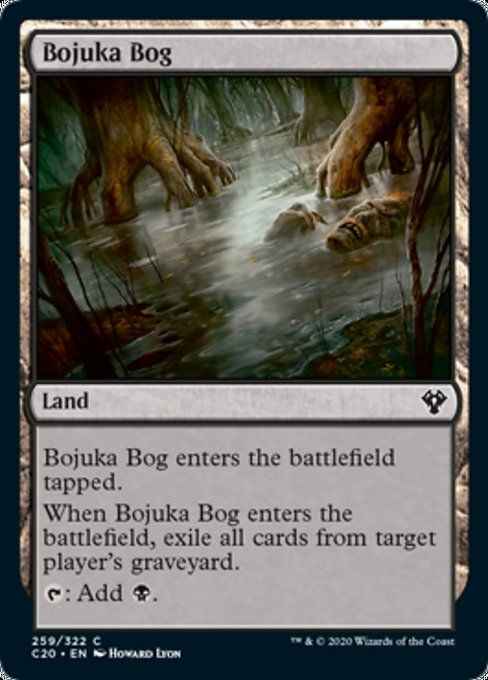 ボジューカの沼が戦場に出たとき、プレイヤー1人を対象とする。そのプレイヤーの墓地にあるすべてのカードを追放する。
