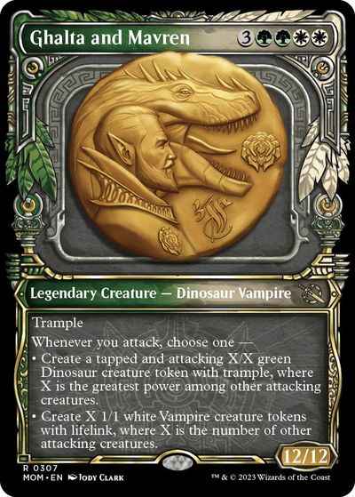 トランプル あなたが攻撃するたび、以下から1つを選ぶ。 ・トランプルを持つ緑のX/Xの恐竜(Dinosaur)クリーチャー・トークン1体をタップ状態かつ攻撃している状態で生成する。Xは、これでない攻撃クリーチャーのパワーの中の最大値に等しい。 ・絆魂を持つ白の1/1の吸血鬼(Vampire)クリーチャー・トークンX体を生成する。Xは、これでない攻撃クリーチャーの数に等しい。