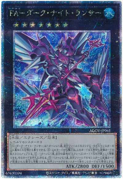 レベル7モンスター×3 「FA-ダーク・ナイト・ランサー」は1ターンに1度、自分フィールドのランク5・6のXモンスターの上に重ねてX召喚する事もできる。・:このカードの攻撃力は、このカードのX素材と装備カードの数×300アップする。・:1ターンに1度、自分の墓地の「エクシーズ」カード1枚を対象として発動できる。そのカードを手札に加える。・:1ターンに1度、自分フィールドのモンスターに装備カードが装備された場合に発動できる。相手フィールドのモンスター1体をこのカードのX素材とする。