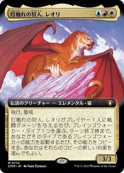 飛行、警戒 灯触れの狩人、レオリがプレイヤー1人に戦闘ダメージを与えるたび、プレインズウォーカー・タイプ1つを選ぶ。ターン終了時まで、あなたがそのタイプであるプレインズウォーカーの能力を起動するたび、その能力をコピーする。あなたはそれらのコピーの新しい対象を選んでもよい。