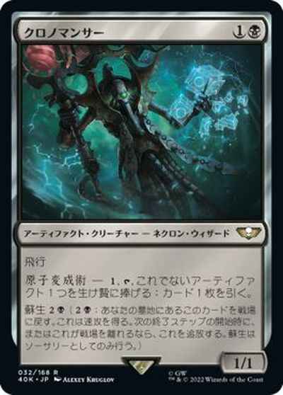 飛行 原子変成術 ― (1),(T),これでないアーティファクト1つを生け贄に捧げる:カード1枚を引く。 蘇生(2)(黒)((2)(黒):あなたの墓地にあるこのカードを戦場に戻す。これは速攻を得る。次の終了ステップの開始時に、またはこれが戦場を離れるなら、これを追放する。蘇生はソーサリーとしてのみ行う。)