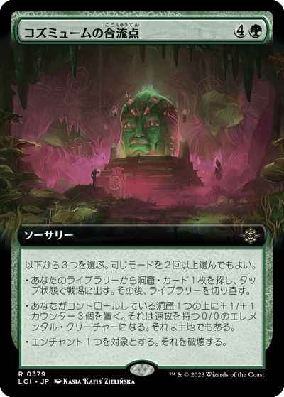 以下から3つを選ぶ。同じモードを2回以上選んでもよい。 ・あなたのライブラリーから洞窟(Cave)カード1枚を探し、タップ状態で戦場に出す。その後、ライブラリーを切り直す。 ・あなたがコントロールしている洞窟1つの上に+1/+1カウンター3個を置く。それは速攻を持つ0/0のエレメンタル(Elemental)・クリーチャーになる。それは土地でもある。 ・エンチャント1つを対象とする。それを破壊する。
