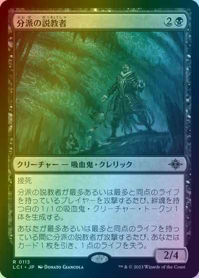 接死 分派の説教者が最多あるいは最多と同点のライフを持っているプレイヤーを攻撃するたび、絆魂を持つ白の1/1の吸血鬼(Vampire)クリーチャー・トークン1体を生成する。 あなたが最多あるいは最多と同点のライフを持っている間に分派の説教者が攻撃するたび、あなたはカード1枚を引き、1点のライフを失う。