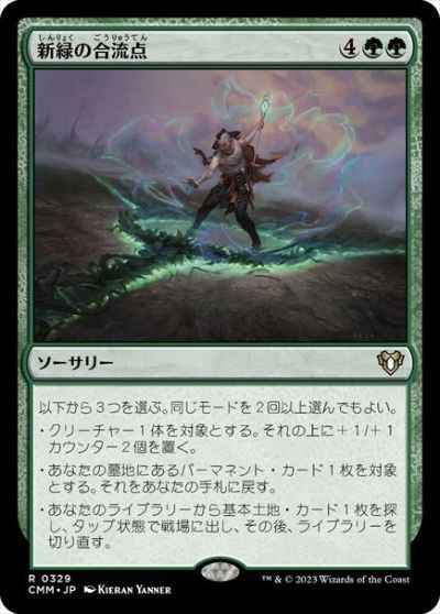 以下から3つを選ぶ。同じモードを2回以上選んでもよい。 ・クリーチャー1体を対象とし、それの上に+1/+1カウンター2個を置く。 ・あなたの墓地にあるパーマネント・カード1枚を対象とし、それをあなたの手札に戻す。 ・あなたのライブラリーから基本土地カードを1枚探し、それをタップ状態で戦場に出す。その後、ライブラリーを切り直す。