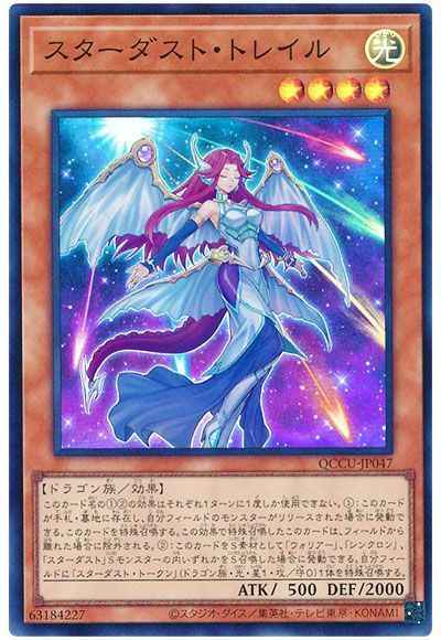 このカード名の(1)(2)の効果はそれぞれ1ターンに1度しか使用できない。(1):このカードが手札・墓地に存在し、自分フィールドのモンスターがリリースされた場合に発動できる。このカードを特殊召喚する。この効果で特殊召喚したこのカードは、フィールドから離れた場合に除外される。(2):このカードをS素材として「ウォリアー」、「シンクロン」、「スターダスト」SモンスターのS召喚に成功した場合に発動できる。自分フィールドに「スターダスト・トークン」(ドラゴン族・光・星1・攻/守0)1体を特殊召喚する。
