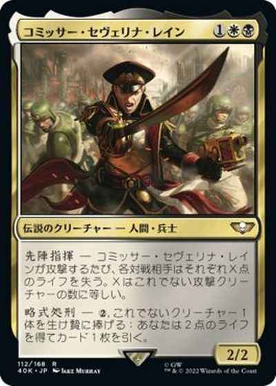 先陣指揮 ― コミッサー・セヴェリナ・レインが攻撃するたび、各対戦相手はそれぞれX点のライフを失う。Xはこれでない攻撃クリーチャーの数に等しい。 略式処刑 ― (2),これでないクリーチャー1体を生け贄に捧げる:あなたは2点のライフを得てカード1枚を引く。