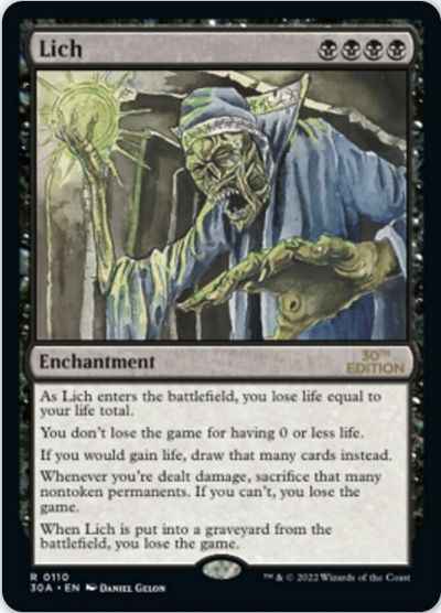 Lichが戦場に出るに際し、あなたはあなたのライフの総量に等しい点数のライフを失う。 あなたは、ライフが0点以下であることでゲームに敗北しない。 あなたがライフを得る場合、代わりに同じ枚数のカードを引く。 あなたにダメージが与えられるたび、同じ数のトークンでないパーマネントを生け贄に捧げる。そうできない場合、あなたはゲームに敗北する。 Lichが戦場からいずれかの墓地に置かれたとき、あなたはゲームに敗北する。