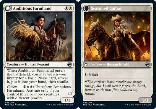 Coven --- {1}{W}{W}: Transform Ambitious Farmhand. Activate only if you control three or more creatures with different powers./Lifelink