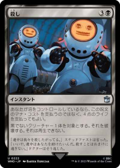 あなたが沼(Swamp)をコントロールしているなら、あなたは、この呪文のマナ・コストを支払うのではなく、4点のライフを支払うことを選んでもよい。 黒でないクリーチャー1体を対象とし、それを破壊する。それは再生できない。