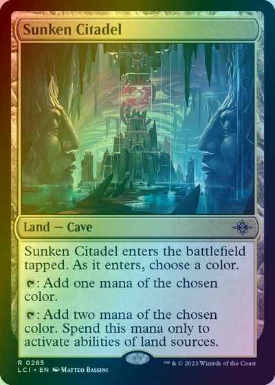 Sunken Citadel enters the battlefield tapped. As it enters, choose a color. {T}: Add one mana of the chosen color. {T}: Add two mana of the chosen color. Spend this mana only to activate abilities of land sources.