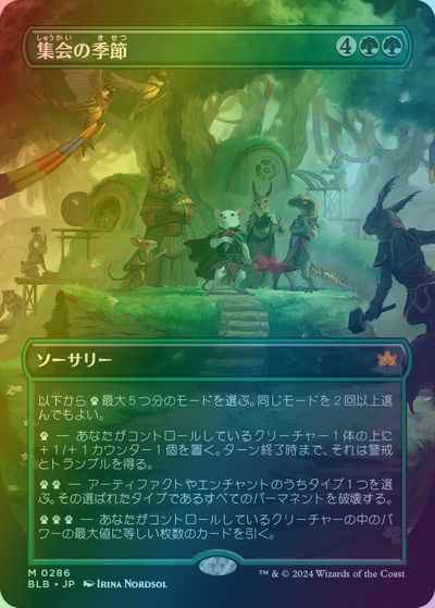 以下から(獣痕)最大5つ分のモードを選ぶ。同じモードを2回以上選んでもよい。 (獣痕) ― あなたがコントロールしているクリーチャー1体の上に+1/+1カウンター1個を置く。ターン終了時まで、それは警戒とトランプルを得る。 (獣痕)(獣痕) ― アーティファクトやエンチャントのうちタイプ1つを選ぶ。その選ばれたタイプであるすべてのパーマネントを破壊する。 (獣痕)(獣痕)(獣痕) ― あなたがコントロールしているクリーチャーの中のパワーの最大値に等しい枚数のカードを引く。