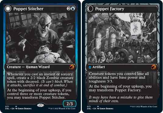 あなたのアップキープの開始時に、あなたが3体以上のクリーチャー・トークンをコントロールしている場合、あなたは戯れ児の縫い師を変身させてもよい。/あなたがコントロールしているすべてのクリーチャー・トークンはすべての能力を失い基本のパワーとタフネスが3/3になる。
